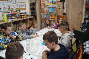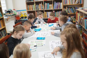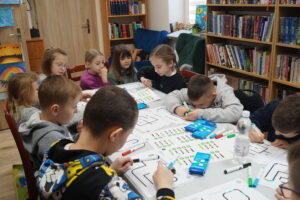 Mali odkrywcy uczyli się sterować tymi miniaturowymi robotami za pomocą kolorowych kodów rysowanych flamastrami. To była świetna lekcja logicznego myślenia przez zabawę!