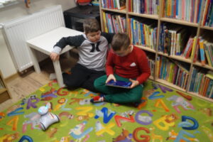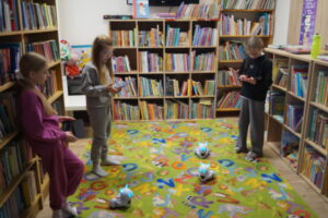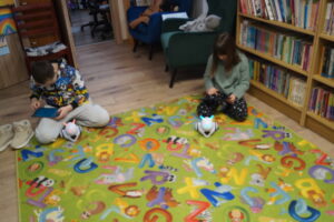 Nasz biały robot-interaktywny przyjaciel przeprowadził nas przez serię wyzwań. Dzieci programowały jego ruchy, zmieniały kolory czułek i reagowały na dźwięki.