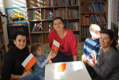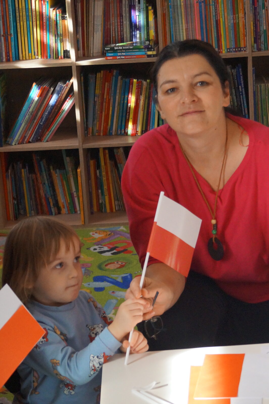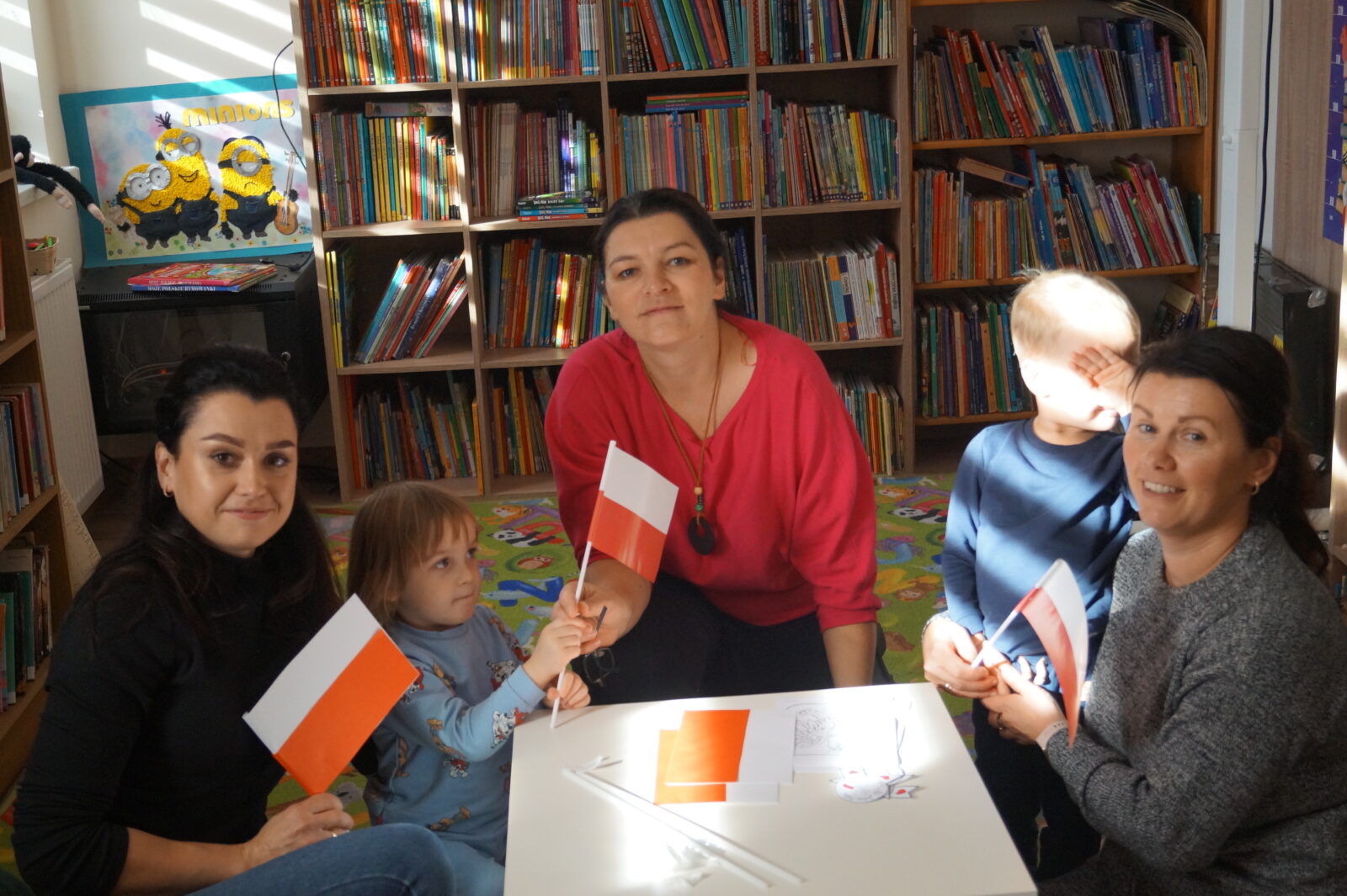 🎨 Po części literackiej przyszedł czas na twórcze warsztaty plastyczne. Dzieci tworzyły własne, małe  flagi. W ruch poszły białe i czerwone kartki oraz klej i pomocne dłonie pań opiekunek.