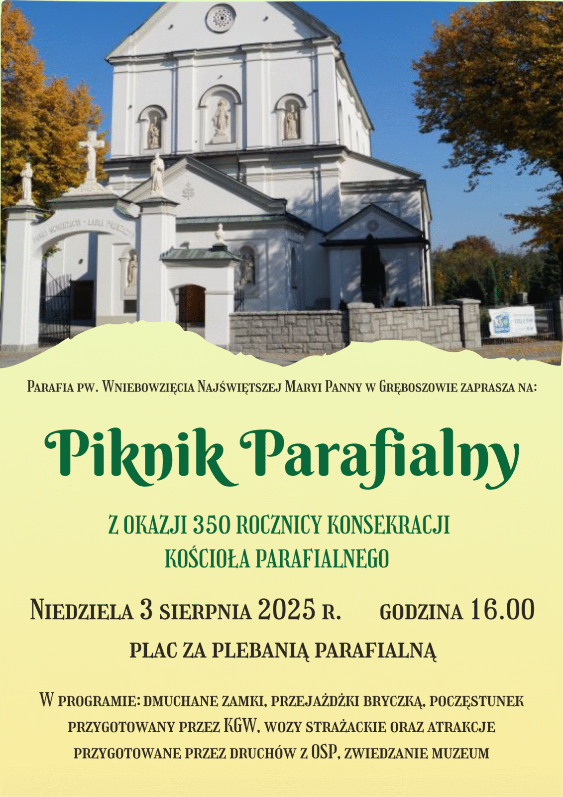 Parafia pw. Wniebowzięcia Najświętszej Maryi Panny w Gręboszowie szykuje się na niezwykłe wydarzenie! Zbliża się bowiem 350. rocznica konsekracji kościoła, a z tej wyjątkowej okazji, z inicjatywy Proboszcza Wiesława Babiarz oraz całej Wspólnoty Parafialnej, odbędzie się wielki piknik dla wszystkich mieszkańców i gości.